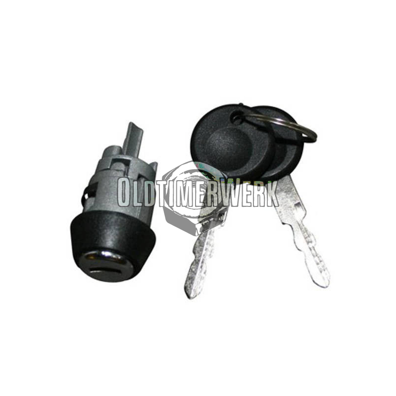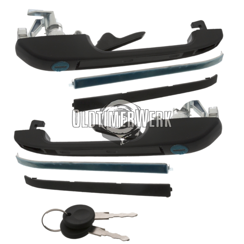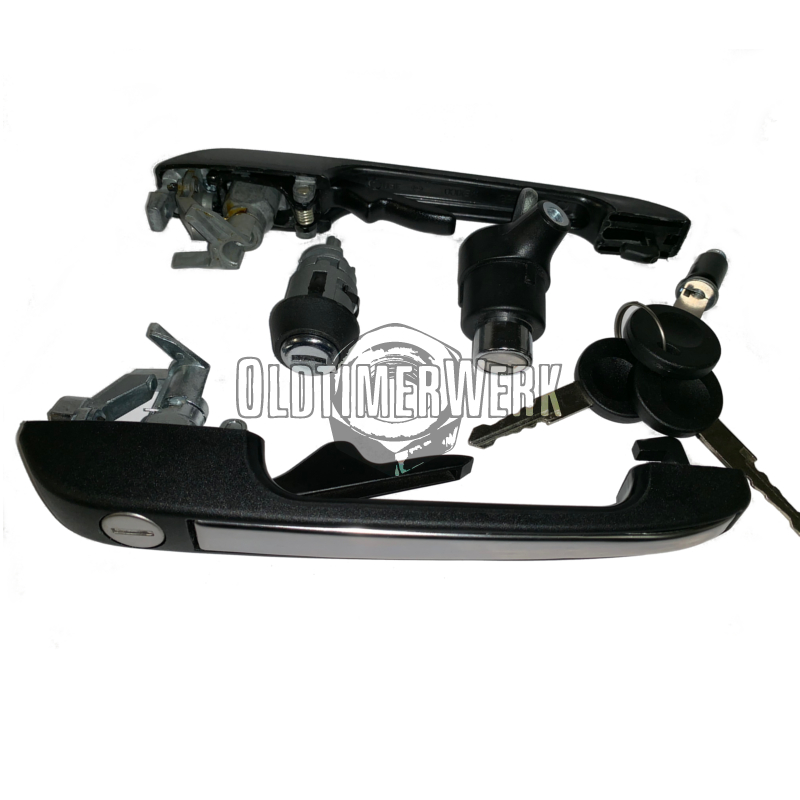 This same-key lock set consists of ignition lock, two door handles for front and rear, and the rear door lock – all coded to a single key. Suitable for Golf 1. The set includes two keys with AH profile. OE numbers are 171827539, 191837205A, 191905855B, and 191837206A.