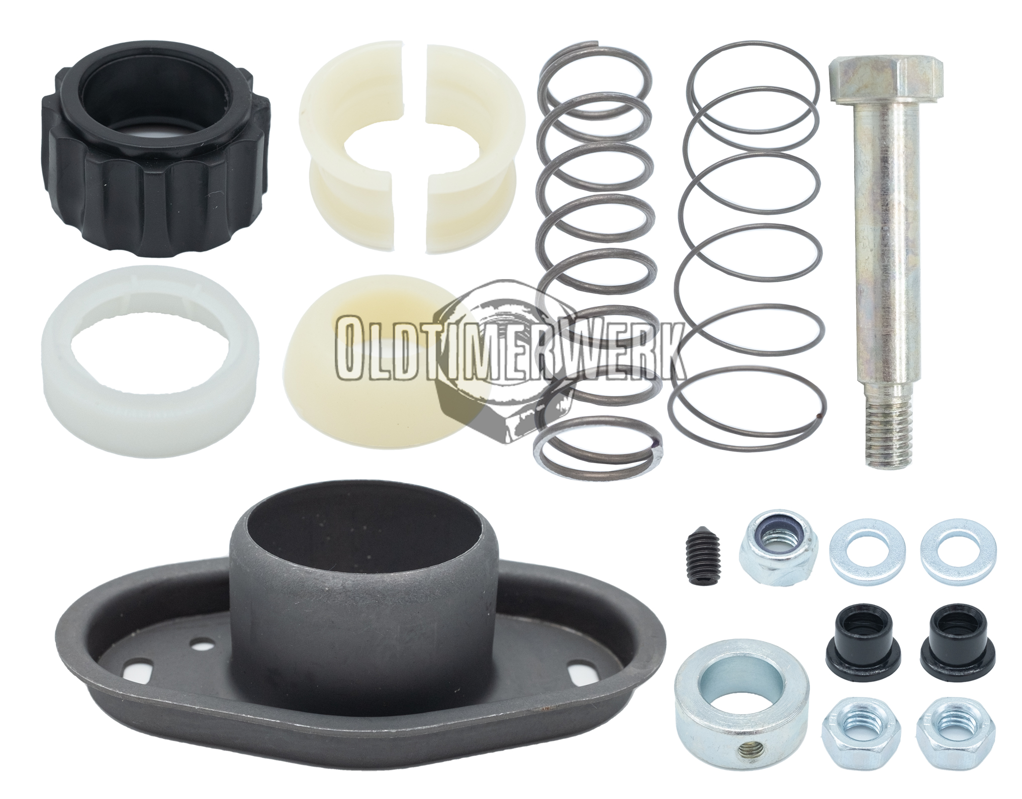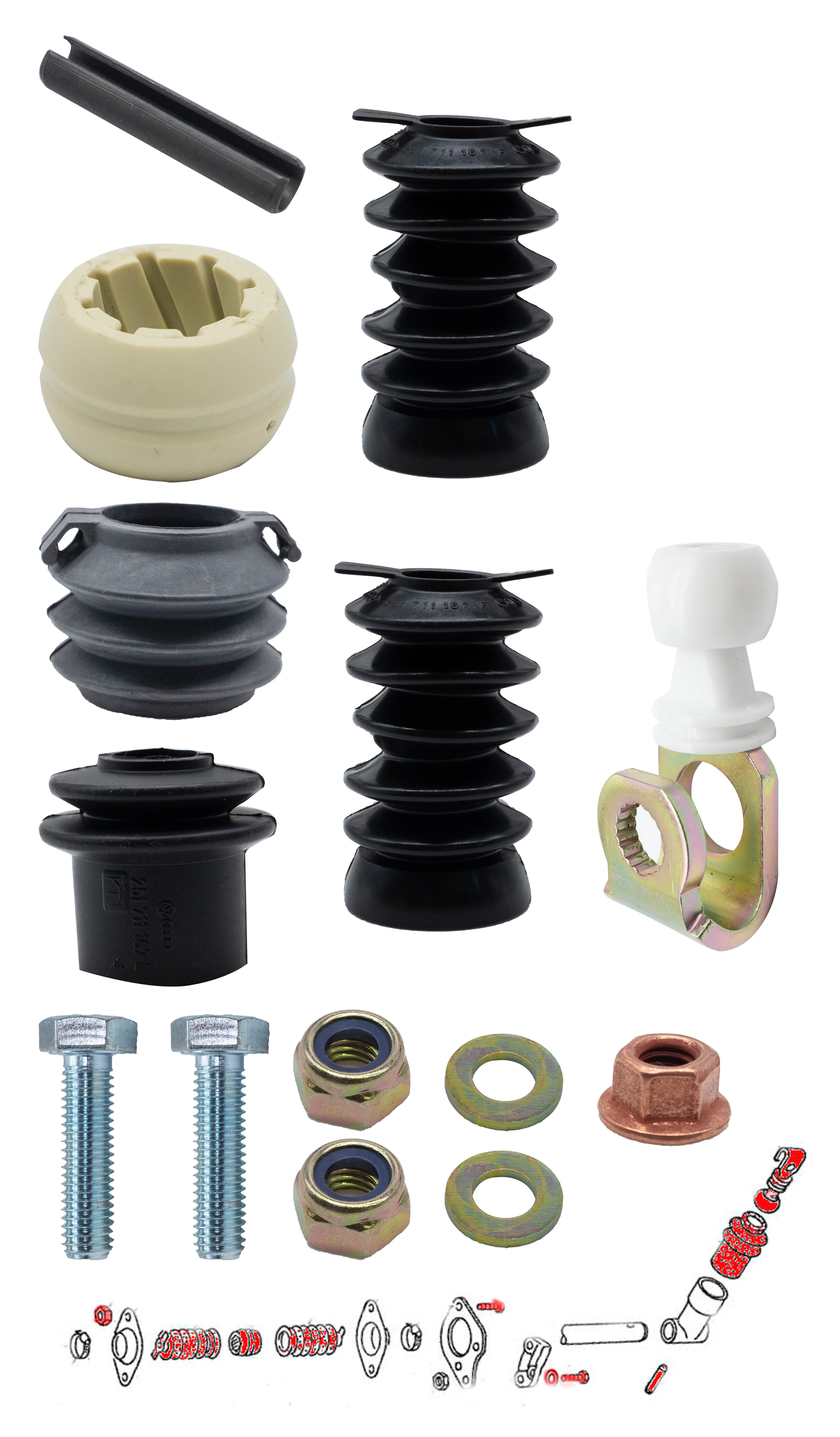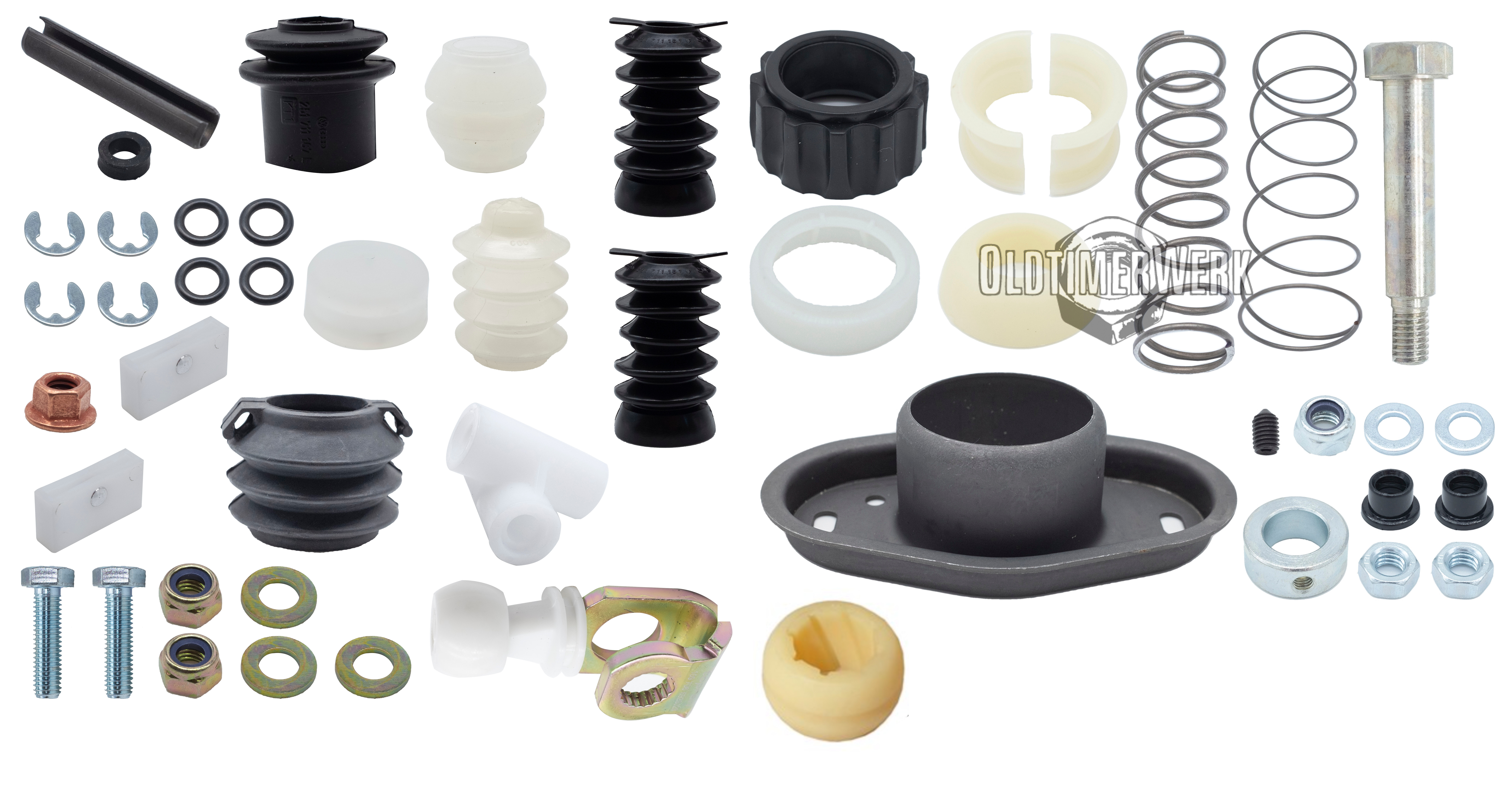 Compact repair kit for the 5-speed gear linkage on the VW T3 bus and T3 flatbed – includes all connecting and guide parts from front to rear. This allows worn or worn-out gear shifting to be adjusted to be crisp and precise again, just as a T3 mechanic would expect. Ideal for maintenance, restoration or before gears start to stick.