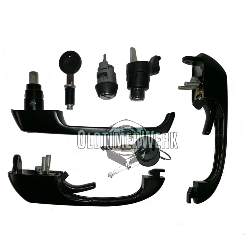 Der Satz besteht aus: 1 Zündschloss, 2 Türgriffen, 1 Schiebetürgriff, 1 Heckklappenschloss.